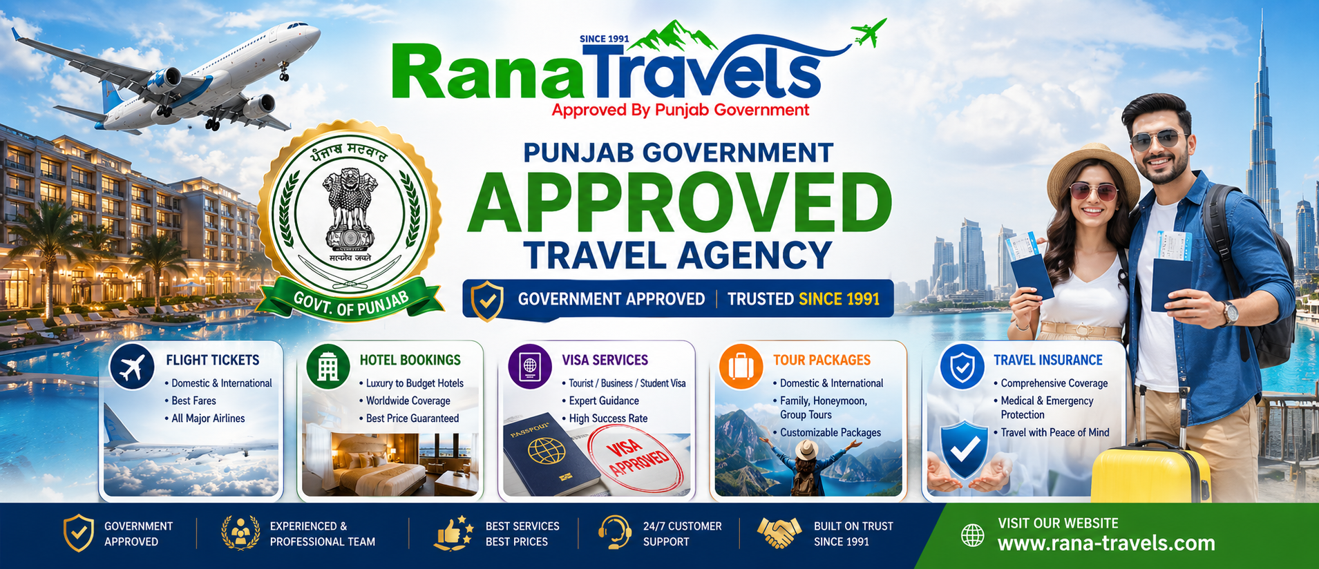 Rana Travels is a leading travel agency in Punjab, approved by the Government of Punjab and serving customers since 1991. We specialize in air ticket booking, tourist visa services, hotel reservations, and customized domestic and international tour packages. Whether you are planning a holiday, business trip, or family visit, our expert team ensures smooth, affordable, and reliable travel solutions tailored to your needs.